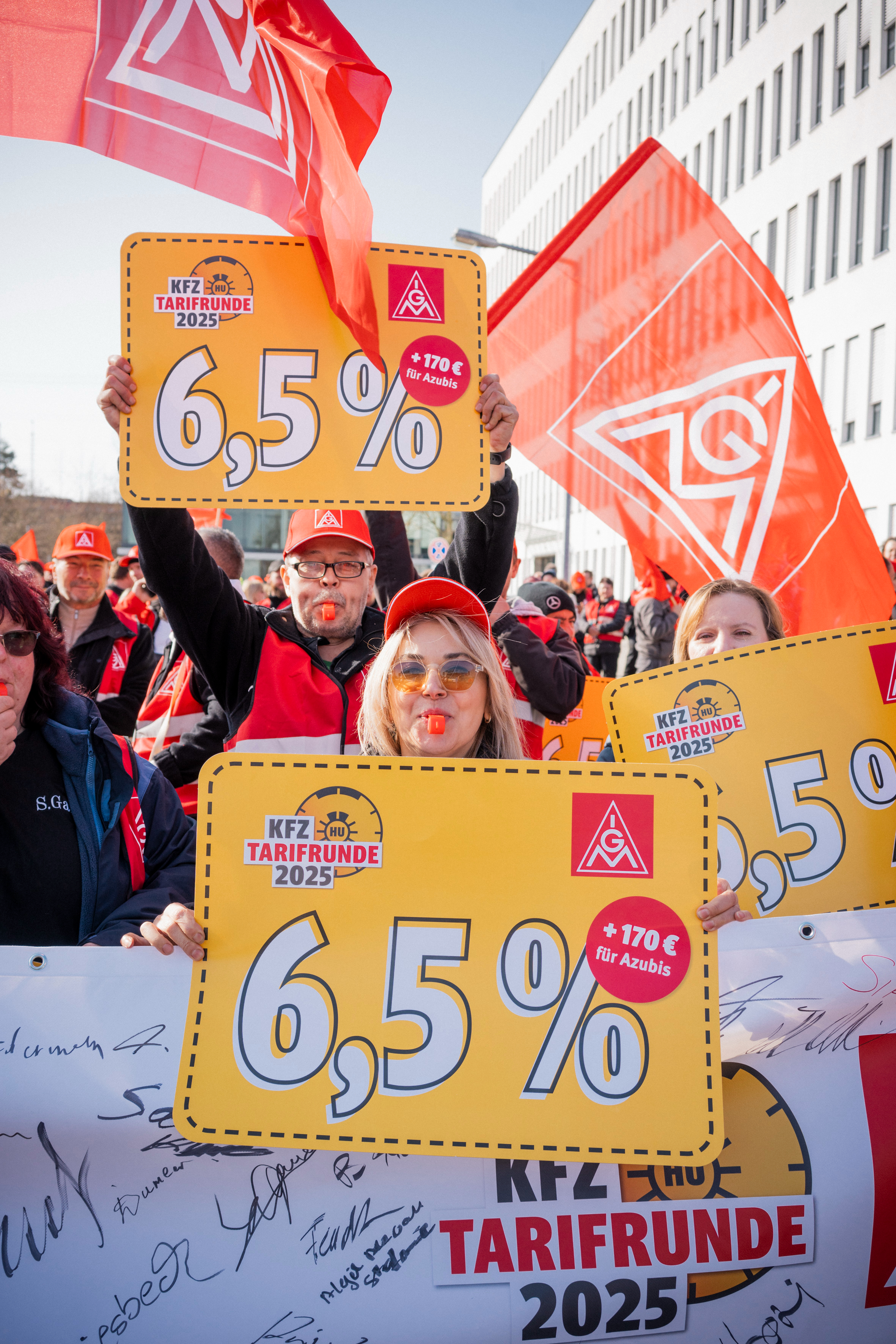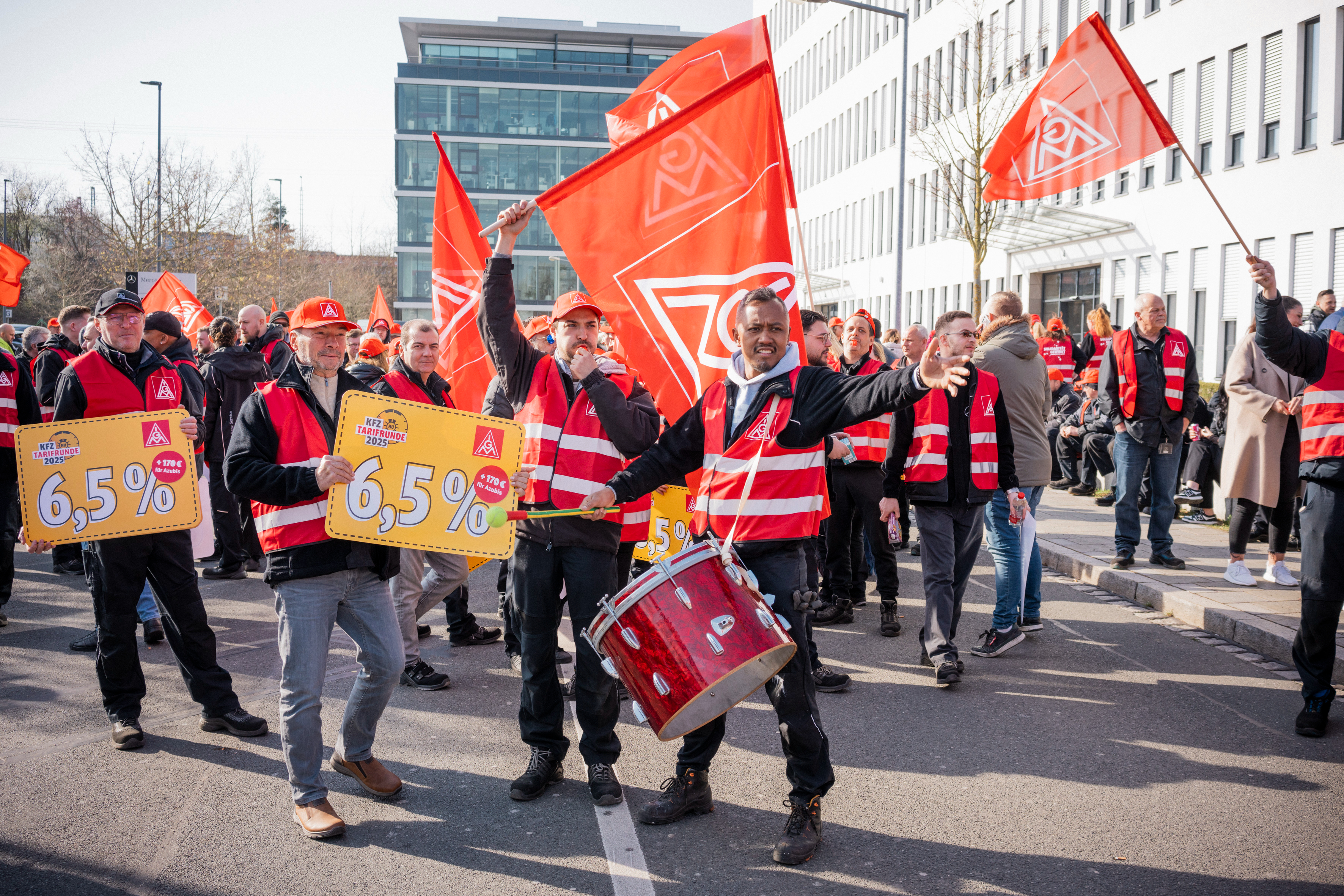 Lautstark machten die Streikenden am Mittwochvormittag Druck auf die Arbeitgeber. Sie fordern eine Entgelthöhung von 6,5 Prozent sowie eine Erhöhung der Ausbildungsvergütung um 170 Euro pro Monat. Zudem forden sie eine Entlastungskomponente, die den Beschäftigten die Wahl zwischen mehr Freizeit oder zusätzlichem Geld ermöglicht.