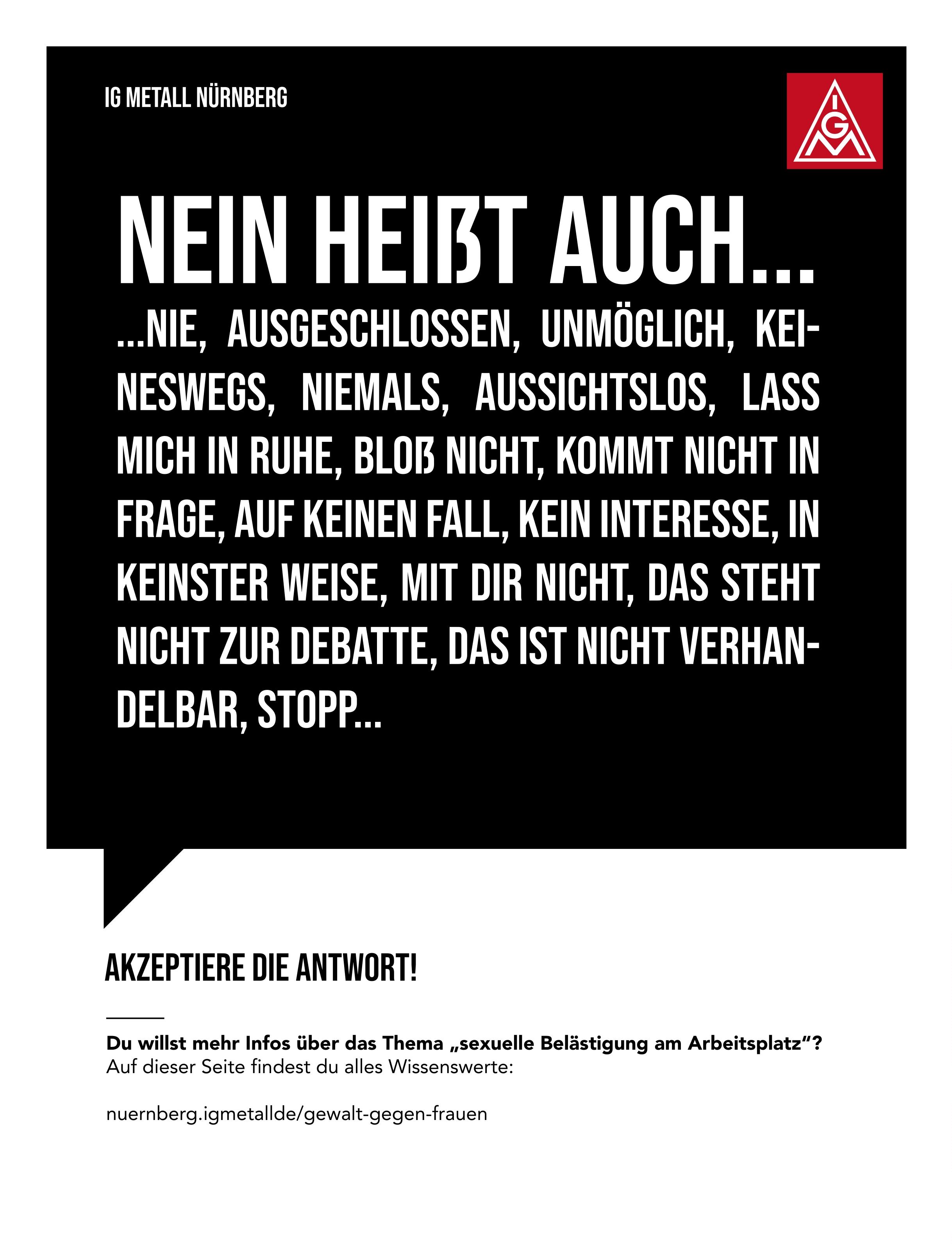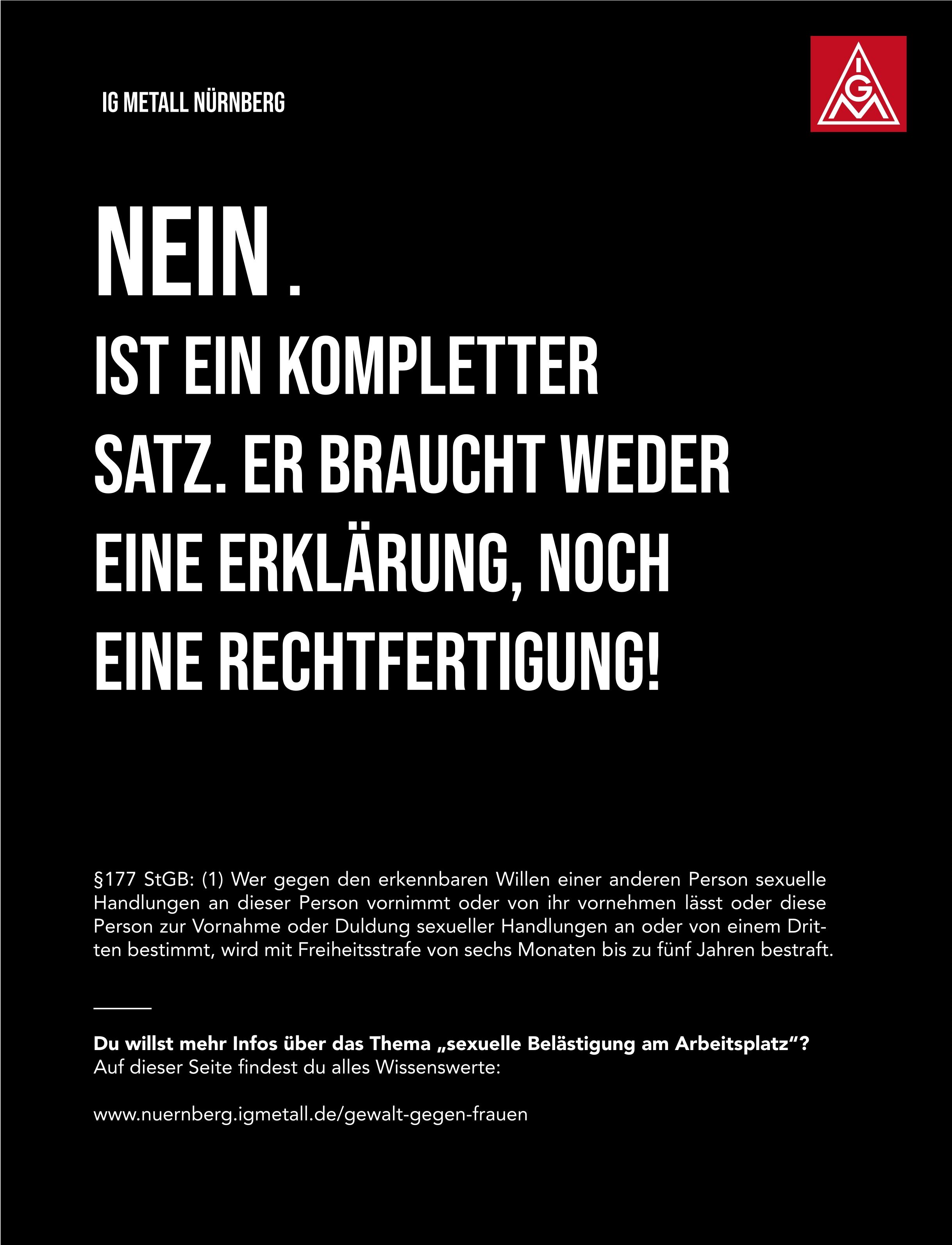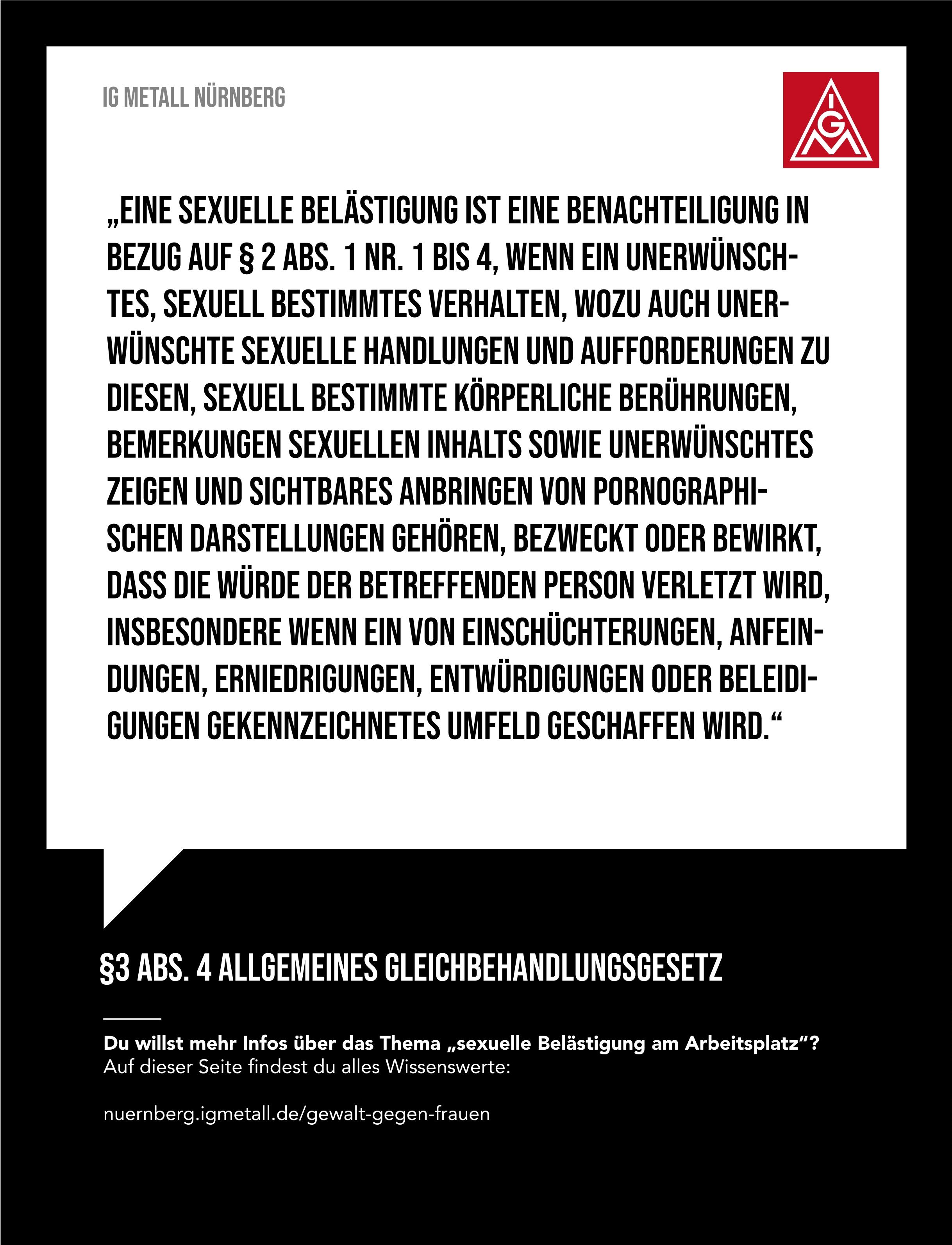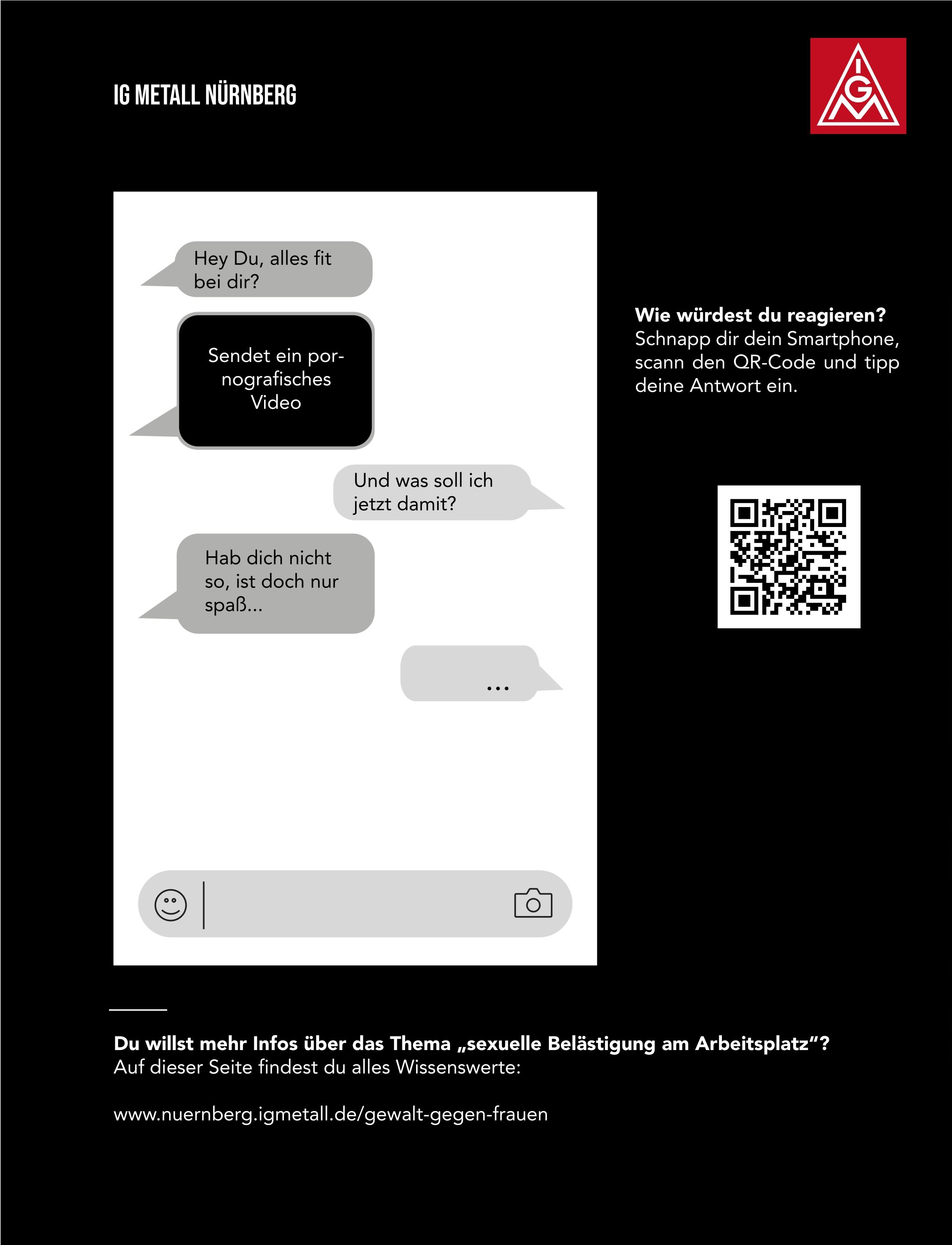 Offensichtlich gibt es hier im Arbeitsumfeld eine Herausforderung für Betriebsrätinnen, Betriebsräte und Vertrauensleute, mit der wir umgehen müssen. Der Arbeitskreis FrauenAktiv hat anlässlich des Frauentags 2022 eine Aktion zu dem Thema gestartet, die wir Euch hier präsentieren wollen. Es gibt Plakate als Download, die ihr in den Betrieben aufhängen könnt, Share-Pic’s für Social Media und einige Links zu Hilfsorganisationen und Notfall-Telefonen. Wir möchten damit einen Beitrag leisten, dass die Übergriffe als solche erkannt werden, Betroffene sich wehren können und Hilfsangebote kennen.