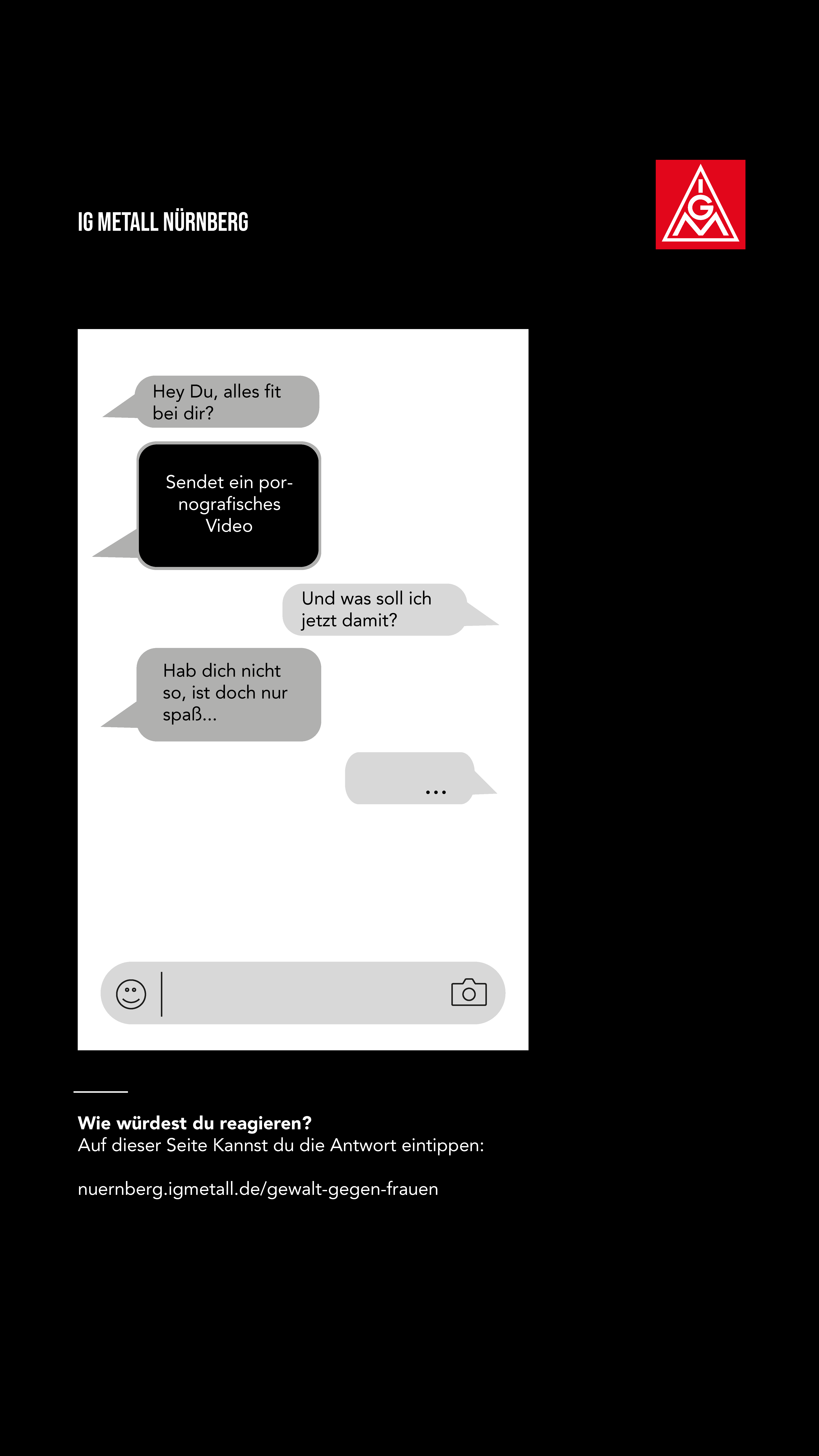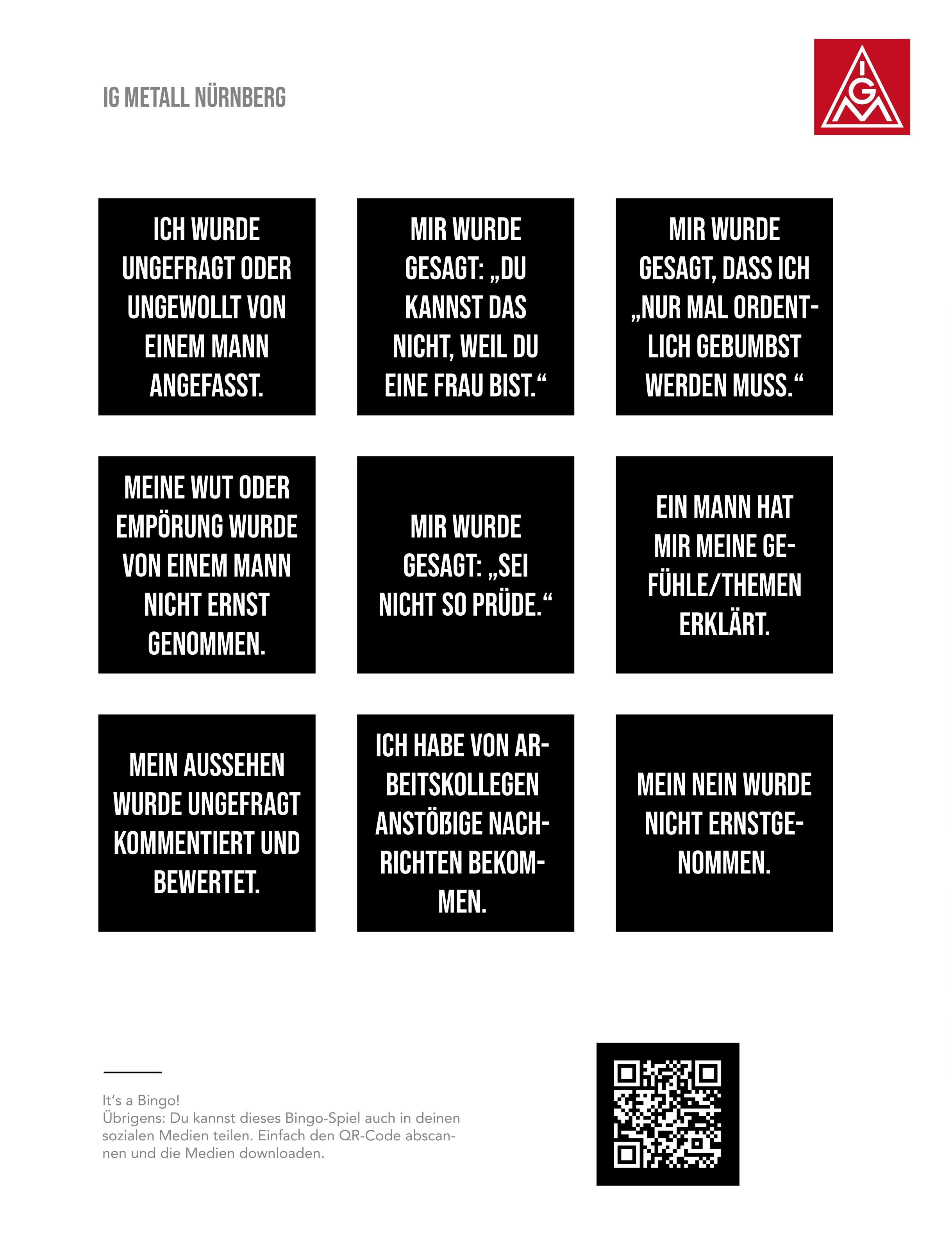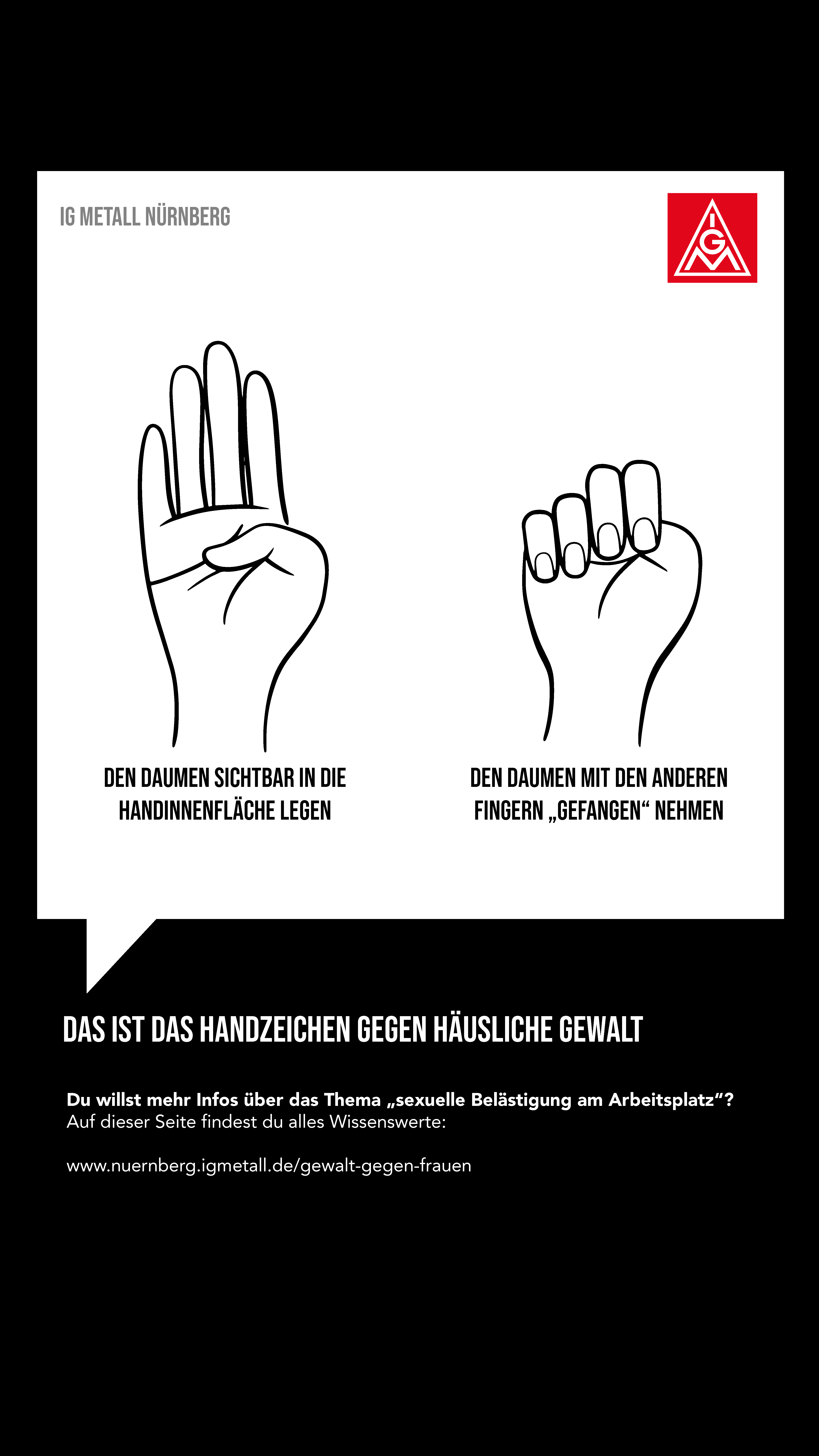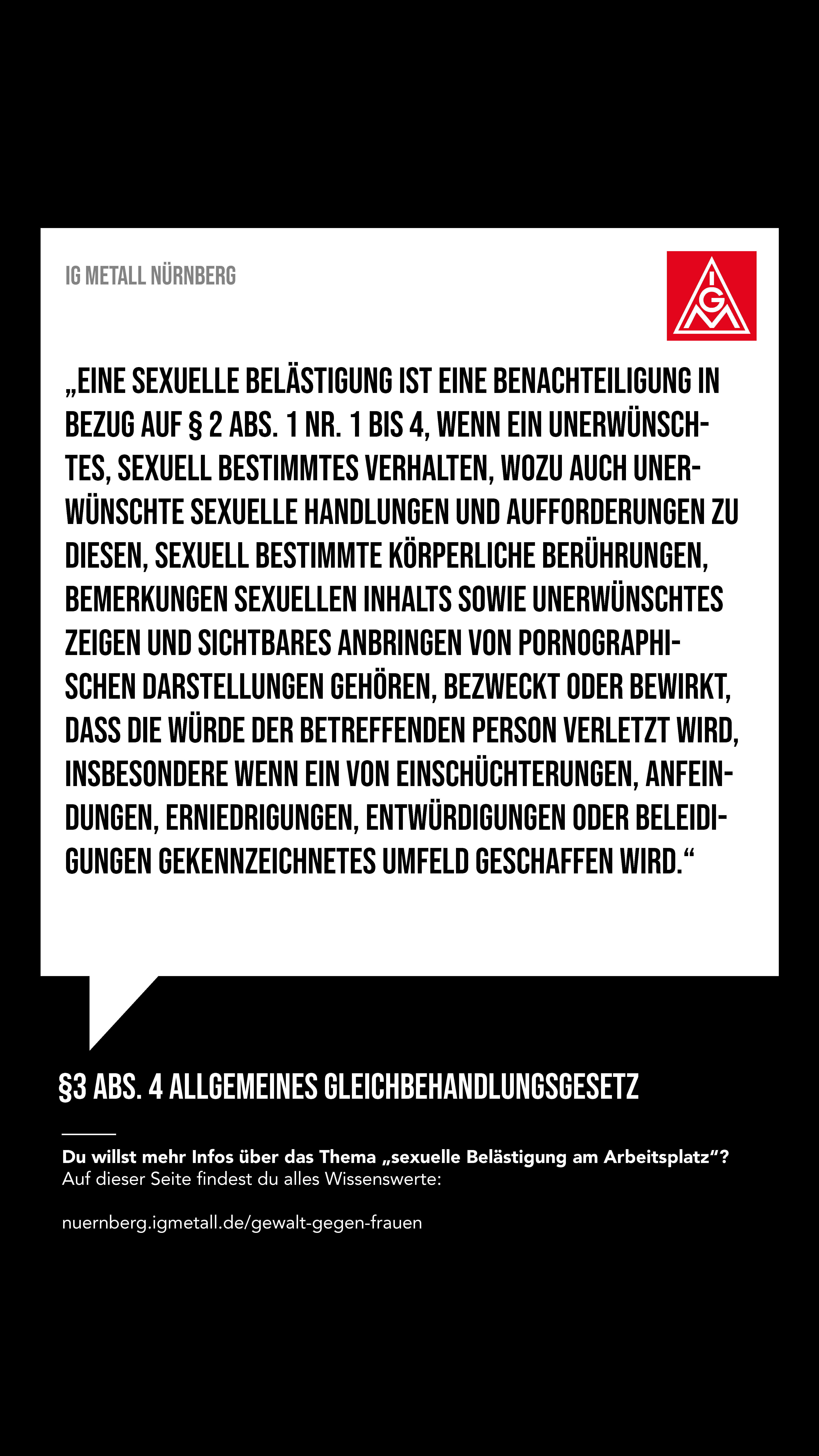 Offensichtlich gibt es hier im Arbeitsumfeld eine Herausforderung für Betriebsrätinnen, Betriebsräte und Vertrauensleute, mit der wir umgehen müssen. Der Arbeitskreis FrauenAktiv hat anlässlich des Frauentags 2022 eine Aktion zu dem Thema gestartet, die wir Euch hier präsentieren wollen. Es gibt Plakate als Download, die ihr in den Betrieben aufhängen könnt, Share-Pic’s für Social Media und einige Links zu Hilfsorganisationen und Notfall-Telefonen. Wir möchten damit einen Beitrag leisten, dass die Übergriffe als solche erkannt werden, Betroffene sich wehren können und Hilfsangebote kennen.