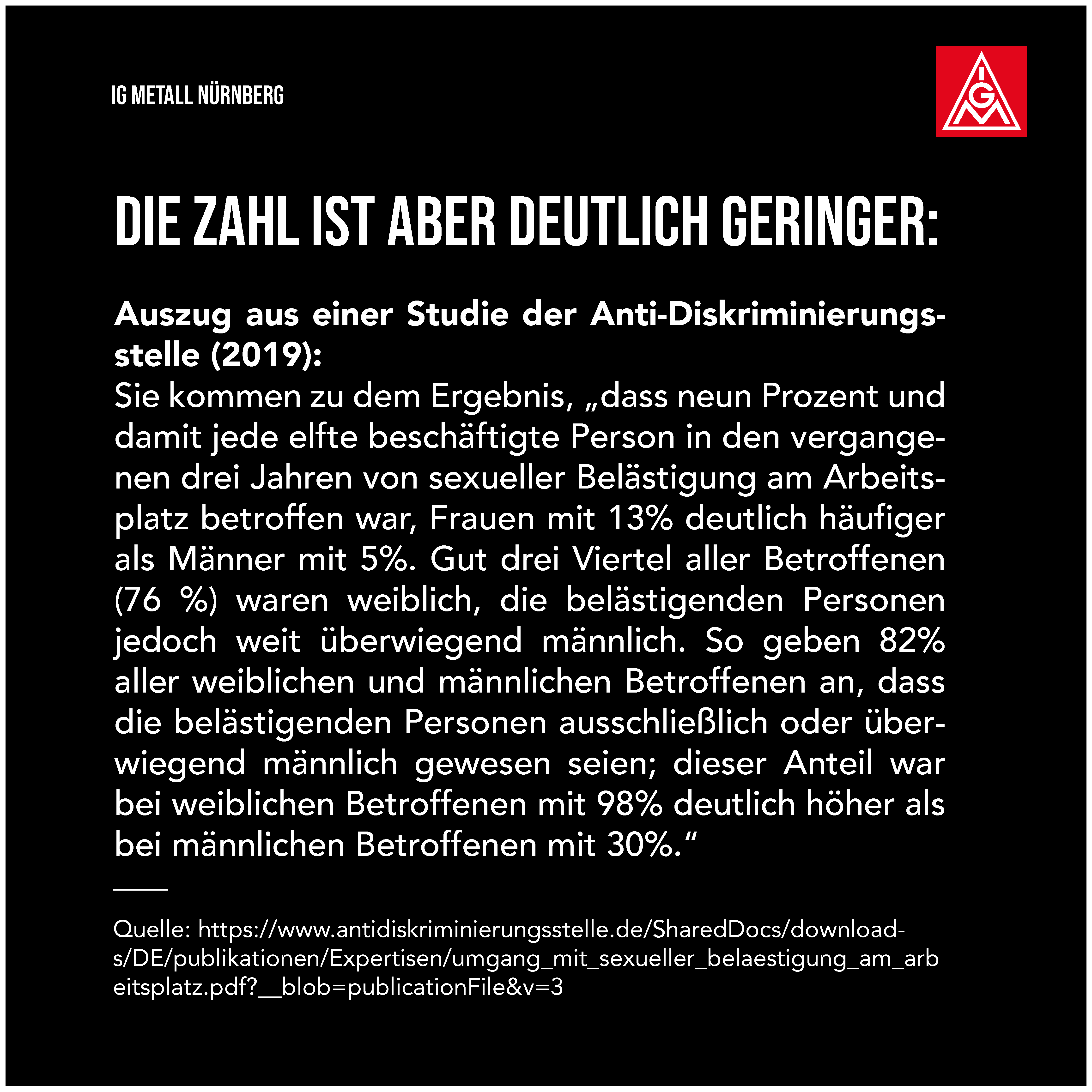 Gewalt gegen Frauen - häufig auch in sexualisierter Form - ist leider weltweit verbreitet, auch in Deutschland sehr präsent und macht vor der Arbeitswelt nicht halt. Wir müssen davon ausgehen, dass sexuelle Belästigung auch in unseren Betrieben jeden Tag stattfindet. Eine Studie der Antidiskriminierungsstelle von 2019 hat ergeben, dass neun Prozent und damit jede elfte beschäftigte Person in den vergangenen drei Jahren von sexueller Belästigung am Arbeitsplatz betroffen war, Frauen mit 13 Prozent deutlich häufiger als Männer mit fünf Prozent. Gut drei Viertel aller Betroffenen (76 Prozent) waren weiblich, die belästigenden Personen jedoch weit überwiegend männlich. So geben 82 Prozent aller weiblichen und männlichen Betroffenen an, dass die belästigenden Personen ausschließlich oder überwiegend männlich gewesen seien; dieser Anteil war bei weiblichen Betroffenen mit 98 Prozent deutlich höher als bei männlichen Betroffenen mit 39 Prozent.*